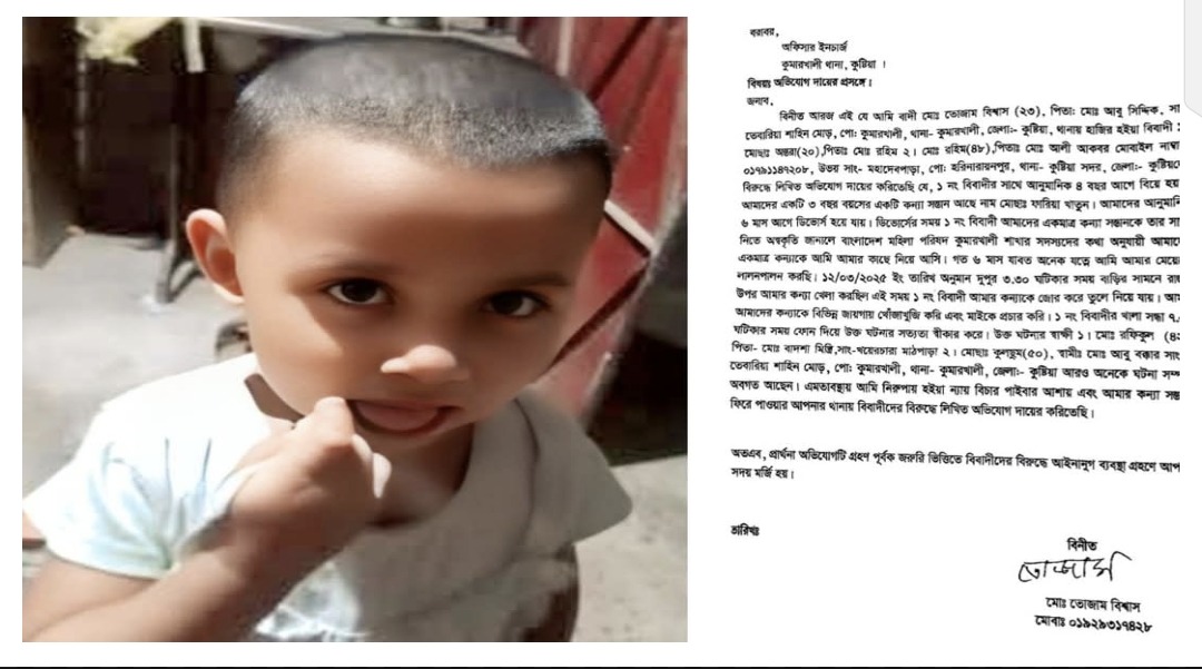 জানা যায়, ৪ বছর আগে তোজাম বিশ্বাস ও অন্তরা খাতুনের পারিবারিক ভাবে বিয়ে হয়। বিয়ের পর থেকেই তাদের মধ্যে বিভিন্ন বিষয় নিয়ে পারিবারিক কলহ চলে এবং গত ৬ মাস আগে তাদের মধ্যে বিচ্ছেদ হয়। বিচ্ছেদের পর অন্তরা খাতুন তার কন্যা সন্তানকে নিজের কাছে রাখতে অস্বীকৃতি জানায়। পরবর্তীতে বাংলাদেশ মহিলা পরিষদ উপজেলা শাখার সদস্যদের মতামত অনুযায়ী তোজাম বিশ্বাস সন্তানকে তার নিজের কাছে রেখে লালন-পালন করছিলেন। এরপর গতকাল বুধবার দুপুর সাড়ে তিনটার সময় তার কন্যা সন্তান ফারিয়া খাতুন বাড়ির পাশে রাস্তার ওপর খেলাধুলা করছিলো এবং সে সময় অন্তরা খাতুন জোর করে তাকে তুলে নিয়ে যায়। পরবর্তীতে সম্ভব্য সকল জায়গায় খোঁজাখুজি করে কোনো সন্ধান পাওয়া যায় না। এরপর সন্ধ্যায় অন্তরার খালা তোজামকে ফোন দিয়ে কন্যা সন্তান নিয়ে যাওয়ার ব্যাপারে জানায়। এব্যাপারে কুমারখালী থানায় অভিযোগ দায়ের করেছেন তোজাম বিশ্বাস।
