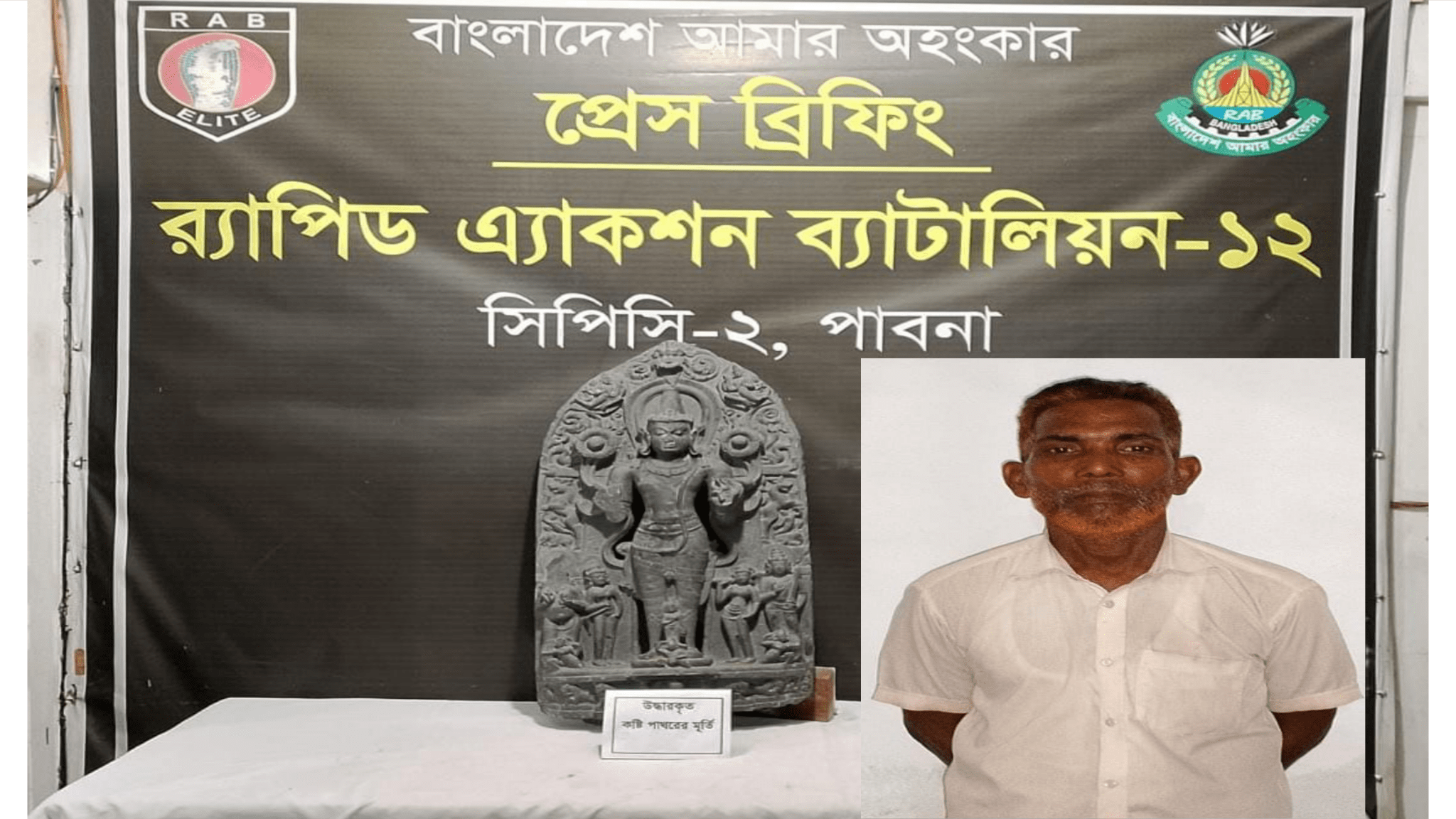 র‍্যাব-১২, সিপিসি-১ কুষ্টিয়া এবং সিপিসি-২ পাবনা ক্যাম্পের  যৌথ অভিযানে ৭৪ কেজি ওজনের কষ্টি পাথরের মূর্তিসহ রাজু আহমেদ বাবু (৪৮) নামের একজন গ্রেফতার।