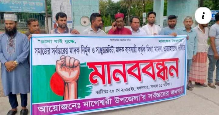 কুড়িগ্রাম জেলার নাগেশ্বরী উপজেলায় সর্বস্তরে মাদক নির্মূল এবং সাঞ্জুয়ারভিটা এলাকার একাধিক মাদক ব্যবসায়ী কর্তৃক অবৈধ ব্যবসা বন্ধে প্রতিবাদকারী ব্যক্তিদের নামে দায়েরকৃত মিথ্যা মামলা প্রত্যাহারের দাবিতে বিশাল মানববন্ধন অনুষ্ঠিত হয়েছে।
