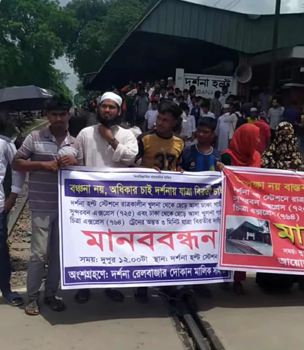 চুয়াডাঙ্গা দর্শনা হল্ট স্টেশনে ঢাকাগামী সুন্দরবন ও খুলনাগামী চিত্রা এক্সপ্রেস ট্রেনের স্টপেজের দাবিতে স্থানীয় বিভিন্ন ব্যানারে রেলপথ অবরোধ করেছে।