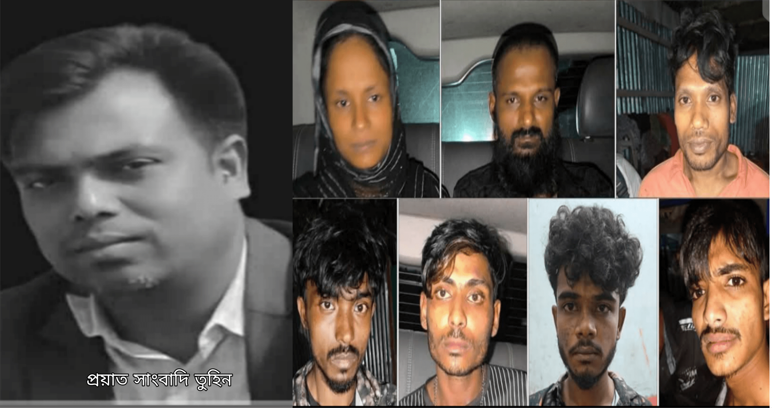 এখন পর্যন্ত সাংবাদিক আসাদুজ্জামান তুহিনকে কুপিয়ে হত্যার ঘটনায় স্বামী-স্ত্রীসহ মোট সাতজনকে গ্রেপ্তার করেছে পুলিশ। শুক্রবার (৮ আগস্ট) রাতে গাজীপুর ও রাজধানীর বিভিন্ন এলাকায় অভিযান চালিয়ে ৫ জনকে আটক করা হয়। তারা হলেন- ফয়সাল ওরফে কেটু মিজান, তার স্ত্রী গোলাপী বেগম, স্বাধীন, আল আমিন ও সুমন। ফয়সালসহ তিনজনকে গাজীপুর সদর উপজেলার ভবানীপুর এলাকা থেকে, আল আমিনকে রাজধানীর উত্তরার তুরাগ এলাকা থেকে এবং স্বাধীনকে হোতাপাড়া এলাকা থেকে গ্রেপ্তার করা হয়েছে। এছাড়াও আজ শনিবার মামলার অন্য দুই আসামিকেও গ্রেপ্তার করা হয়। পাবনার পাচবাড়িয়া এলাকার বাসিন্দা ও ভাড়াটিয়া মো. ফয়সাল হাসান (২৩) এবং কুমিল্লার হোমনা থানার বাসিন্দা মো. শাহ জালালকে (৩২) ময়মনসিংহের গফরগাঁও থানা থেকে গ্রেপ্তার করেছে আইনশৃঙ্খলা বাহিনী।