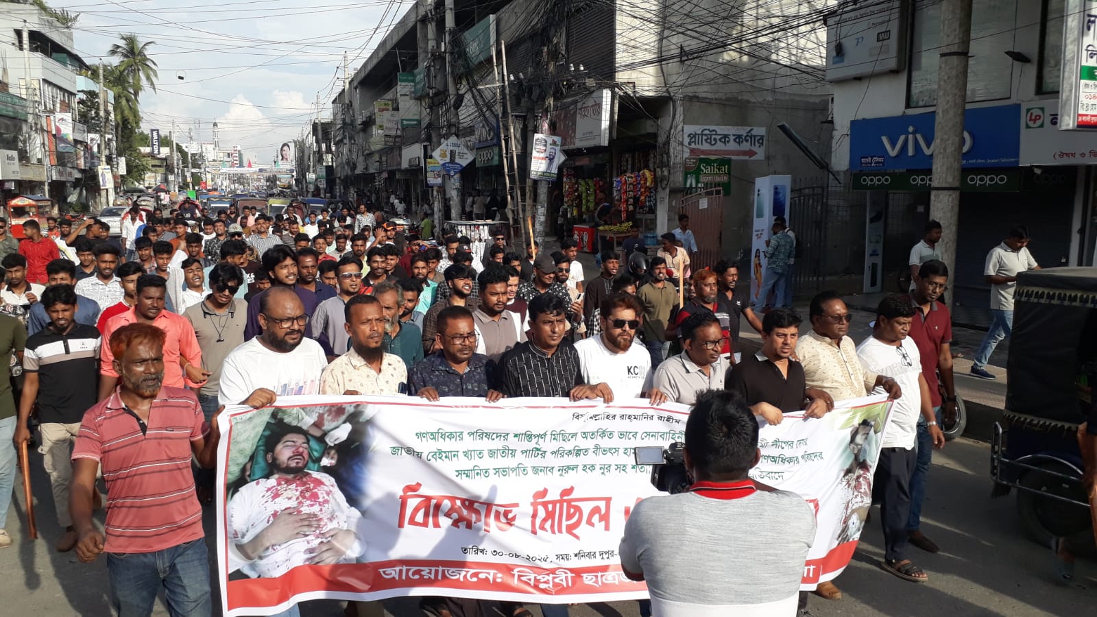 ডাকসুর সাবেক ভিপি ও গনঅধিকার পরিষদের সভাপতি নুরুল হক নুরের ওপর হামলার প্রতিবাদে কুষ্টিয়ায় বিপ্লবী ছাত্র জনতা বিক্ষোভ মিছিল করেছে। শনিবার (৩০ আগষ্ট) বিকেল ৪টার দিকে ফায়ার সার্ভিস সংলগ্ন কুষ্টিয়া জেলা গনঅধিকার পরিষদ কার্যালয়ের সামনে থেকে বিক্ষোভ মিছিল করেন দলীয় নেতাকর্মী। মিছিলটি শহরের পাঁচ রাস্তা মোড় হয়ে সাদ্দাম বাজারসহ কুষ্টিয়া-ঝিনাইদহ মহাসড়ক অতিক্রম করে মজমপুর ট্রাফিক মোড়ে অবস্থান নেয় এবং মহাসড়ক অবরোধ করেন। এতে মহাসড়কের উভয় লেন কুষ্টিয়া-ঝিনাইদহ ও কুষ্টিয়া-ঈশ্বরদী অভিমূখী সড়কে যান চলাচল বন্ধ হয়ে যায়।