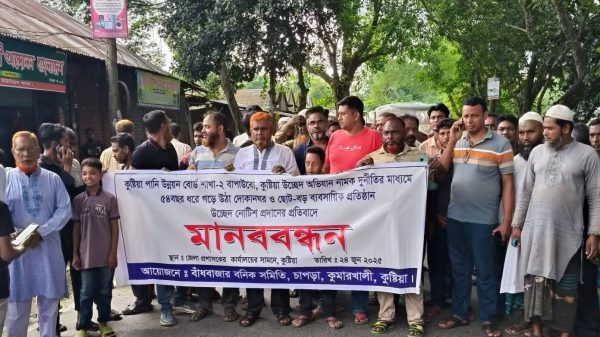 কুষ্টিয়ায় ব্যবসা প্রতিষ্ঠান ও বসতবাড়ি রক্ষায় এলাকাবাসীর মানববন্ধন