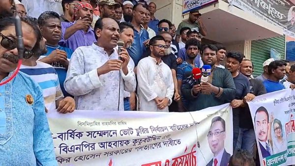 ভোট কারচুপির অভিযোগে কাফনের কাপড় পড়ে কুষ্টিয়া জেলা বিএনপির কার্যালয় ঘেরাও