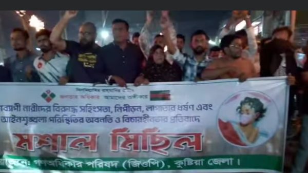 মোঃ রবিউল ইসলাম হৃদয়, কুষ্টিয়া : দেশব্যাপী নারীর বিরুদ্ধে সহিংসতা, নিপীড়ন, লাগাতার ধর্ষণ এবং আইনশৃঙ্খলা পরিস্থিতির অবনতি ও বিচারহীনতার প্রতিবাদে মশাল মিছিল করেছে গণঅধিকার পরিষদ কুষ্টিয়া শাখা। সোমবার সন্ধ্যায় শহরের