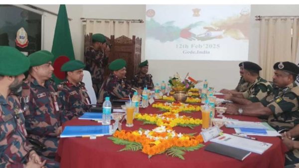 মাহমুদ হাসান রনি, চুয়াডাঙ্গা প্রতিনিধিঃ চুয়াডাঙ্গার দর্শনা সীমান্তের ওপারে বিজিবি-বিএসএফ সেক্টর কমান্ডার পর্যায়ে বৈঠক অনুষ্ঠিত হয়েছে। বুধবার সকালে ভারতের কৃষ্ণনগর বিএসএফ সেক্টরের আয়োজনে চুয়াডাঙ্গার দর্শনা জয়নগর সীমান্তের ওপারে ৩২ বিএসএফ