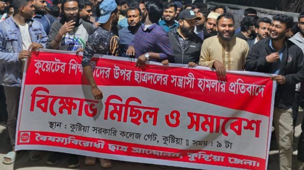 কুষ্টিয়া প্রতিনিধিঃ কুয়েটের শিক্ষার্থীদের উপর ছাত্রদলের সন্ত্রাসী হামলার প্রতিবাদে বৈষম্যবিরোধী ছাত্র আন্দোলনের নেতৃত্বে বিক্ষোভ মিছিল ও সমাবেশ অনুষ্ঠিত হয়েছে। খুলনা প্রকৌশল ও প্রযুক্তি বিশ্ববিদ্যালয়ের সাধারণ শিক্ষার্থীদের উপর ছাত্রদলের সন্ত্রাসী হামলার