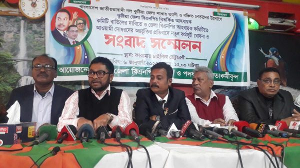 নিজস্ব প্রতিনিধিঃ কুষ্টিয়ায় জেলা বিএনপির ত্যাগী ও পদবঞ্চিত নেতা কর্মীরা তিন দিনের কর্মসূচি ঘোষণা করে সংবাদ সম্মেলন করেছে। সংবাদ সম্মেলনে জেলা বিএনপির ত্যাগী, পরীক্ষিত ও আওয়ামী সরকারের আমলে নির্যাতিত নেতা-কর্মীদের