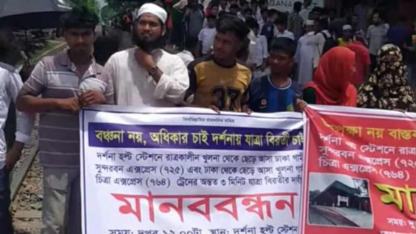 দর্শনায় ট্রেনের স্টপেজের দাবিতে ট্রেন থামিয়ে অবরোধ