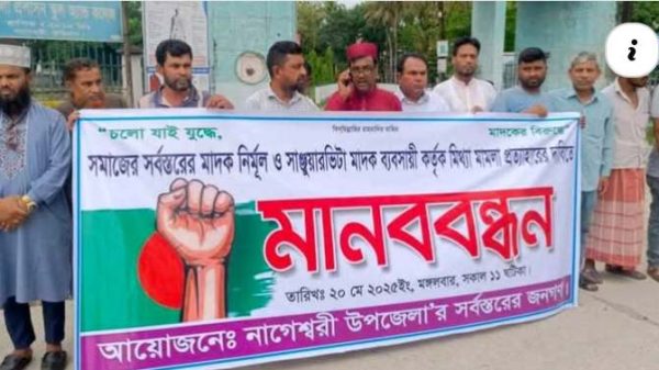 নাগেশ্বরীতে মাদক নির্মূলে ও মিথ্যা মামলা প্রত্যাহারের দাবিতে মানববন্ধন