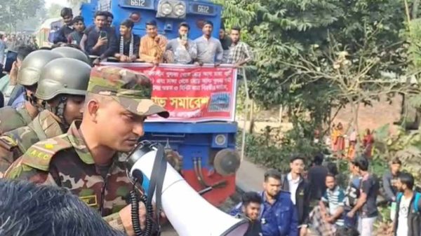 মাহমুদ হাসান রনি,চুয়াডাঙ্গা প্রতিনিধিঃ চুয়াডাঙ্গার দর্শনা হল্ট স্টেশনে বৈষম্যবিরোধী ছাত্র ও স্থানীয় জনতা রাতে ঢাকাগামী সুন্দরবন ও খুলনাগামী চিত্রা এক্সপ্রেস ট্রেন তিন মিনিট যাত্রা বিরতি দেয়ার দাবিতে ট্রেন থামিয়ে বিক্ষোভ