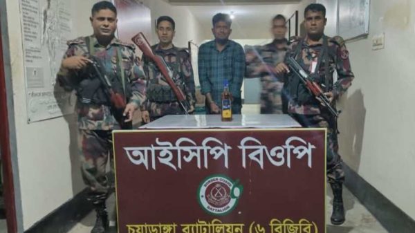 মাহমুদ হাসান রনি, চুয়াডাঙ্গা প্রতিনিধিঃ চুয়াডাঙ্গার দর্শনার জয়নগর চেকপোস্টের সামনে পাশ থেকে বর্ডার গার্ড বাংলাদেশ (বিজিবি)ভারতীয় মদসহ এক ভুয়া পুলিশকে আটক করেছে। আটককৃত ভূয়া পুলিশকে শুক্রবার জেলহাজতে প্রেরণ করা হয়েছে।
