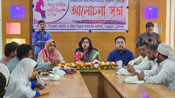 মাহমুদ হাসান রনি, চুয়াডাঙ্গা প্রতিনিধিঃ চুয়াডাঙ্গার দামুড়হুদায় আন্তর্জাতিক নারী দিবস উপলক্ষে র্যালি ও আলোচনা সভা অনুষ্ঠিত হয়েছে। শনিবার সকাল ১০ টায় ” অধিকার সমতা ক্ষমতায়ন, নারী ও কন্যার উন্নয়ন ”