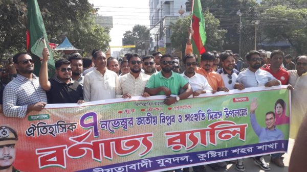 নিজস্ব প্রতিনিধিঃ ঐতিহাসিক ৭ নভেম্বর জাতীয় বিপ্লব ও সংহতি দিবস উপলক্ষে বাংলাদেশ জাতীয়তাবাদী দল বিএনপি কুষ্টিয়া জেলা শাখার নবগঠিত আহবায়ক কমিটির উদ্যোগে শোভাযাত্রা অনুষ্ঠিত হয়েছে। এই শোভাযাত্রা সফল করতে কুষ্টিয়া
