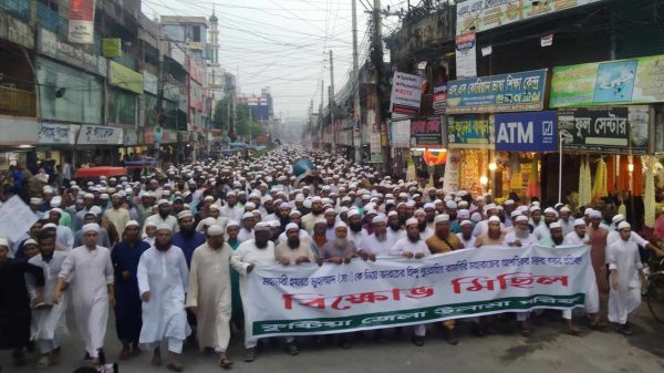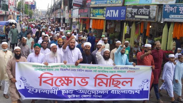 নিজস্ব প্রতিনিধিঃ কুষ্টিয়ায় উলামা ও ইমাম পরিষদ বিক্ষোভ মিছিল ও সমাবেশ করেছে। রবিবার (২৯ সেপ্টেম্বর) বিকেল ৫টার দিকে কুষ্টিয়া শহরে জেলা উলামা পরিষদ ও ইমাম পরিষদের উদ্যোগে, মহানবী হযরত মুহাম্মদ