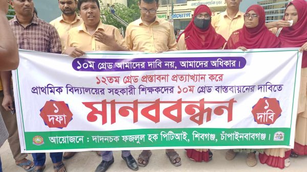 সোহেল রানা,ভ্রাম্যমান,প্রতিনিধি: চাঁপাইনবাবগঞ্জের শিবগঞ্জে প্রাথমিক বিদ্যালয়ের সহকারী শিক্ষকদের ১০ম গ্রেড বাস্তবায়নের এক দফা দাবিতে মানববন্ধন কর্মসূচি অনুষ্ঠিত হয়েছে । সোমবার (২৩ সেপ্টেম্বর) দুপুরে দাদনচক ফজলুল হক পিটিআইয়ের ব্যানারে প্রতিষ্ঠানটির প্রধান
