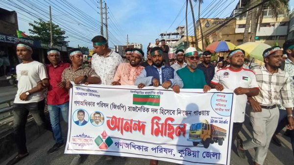 আবীর হাসান স্বাধীন: গণ অধিকার পরিষদ (জিওপি) নিবন্ধন পাওয়ায় কুষ্টিয়ায় আনন্দ মিছি়ল ও সমাবেশ করেছে দলীয় নেতাকর্মীরা। এ উপলক্ষে সোমবার (৩ সেপ্টেম্বর) বিকালে বড়বাজার রেলগেট থেকে আনন্দ মিছিল বের করা