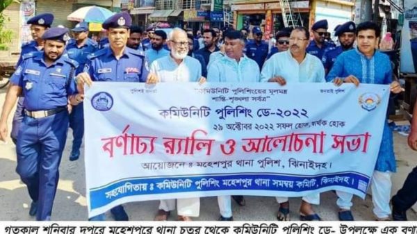 সেলিম রেজা, মহেশপুর(ঝিনাইদহ)প্রতিনিধিঃ- “পুলিশই জনতা,জনতাই পুলিশ” কমিউনিটি পুলিশিংয়ের মূলমন্ত্র শান্তি শৃঙ্খলা সর্বত্র এই প্রতিপাদ্য কে সামনে রেখে কমিউনিটি পুলিশং ডে ২০২২ ইং উপলক্ষে র্যালি ও আলোচনা সভা অনুষ্ঠিত হয়েছে। কমিউনিটি