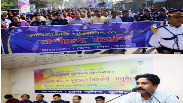 সমাচার ডেস্ক অনলাইনঃ “কমিউনিটি পুলিশিংয়ের মূলমন্ত্র শান্তি-শৃঙ্খলা সর্বত্র” এই প্রতিপাদ্যকে সামনে রেখে কমিউনিটি পুলিশিং ২০২২ উদযাপন উপলক্ষে কুষ্টিয়ায় বর্ণাঢ্য র্যালি, কেক কাটা ও আলোচনা সভা সহ নানা কর্মসূচীর মধ্য দিয়ে