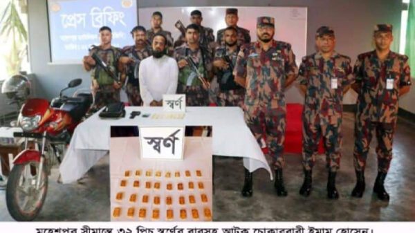 সেলিম রেজা,মহেশপুর(ঝিনাইদহ)প্রতিনিধিঃ ঝিনাইদহের মহেশপুর উপজেলার যাদবপুর সীমান্ত থেকে ৩২ পিচ স্বর্ণের বারসহ ইমাম হোসেন (৩০) নামের এক যুবককে আটক করেছে ৫৮ বিজিবি। শনিবার সকালে যাদবপুর সীমান্ত এলাকার বড়বাড়ি গ্রামের বিকে