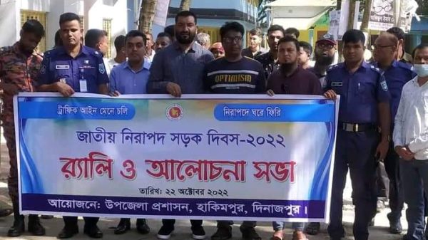 হাকিমপুর থানা প্রতিনিধি মো:ওয়াজ কুরনী ট্রাফিক আইন মেনে চলি নিরাপদে ঘরে ফিরি’ এই প্রতিপাদ্যকে সামনে রেখে দিনাজপুরের হাকিমপুর হিলিতে র্যালি ও আলোচনা সভার মধ্যে দিয়ে জাতীয় নিরাপদ সড়ক দিবস পালিত
