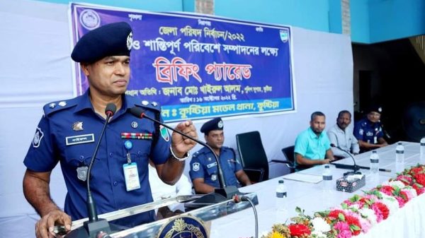 সমাচার ডেস্ক অনলাইনঃ রবিবার (১৬ অক্টোবর, ২০২২) সকাল সাড়ে ১১ টায় কুষ্টিয়া মডেল থানা প্রাঙ্গণে জেলা পরিষদ নির্বাচন ২০২২ উপলক্ষে নির্বাচনী কাজে নিয়োজিত পুলিশ অফিসার – ফোর্সের এক ব্রিফিং প্যারেডের