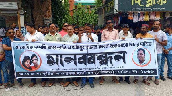 সমাচার ডেস্ক অনলাইন : বাংলাদেশের আলোচিত সাংবাদিক দম্পতি সাগর-রুনী ও কুষ্টিয়ার সাংবাদিক হাসিবুর রহমান রুবেলের হত্যাকান্ডের বিচারের দাবিতে মানববন্ধন অনুষ্ঠিত হয়েছে। শনিবার (২৫ আগস্ট) কুষ্টিয়া প্রেসক্লাবের সামনে সকাল ১১ টাই