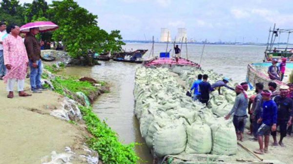 শিপন আলী,ভেড়ামারা প্রতিনিধি: কুষ্টিয়ার ভেড়ামারায় বাঁধ ধসে যাওয়ার আশঙ্কায় মসলেমপুর বেড়িবাঁধে নিয়ে যাওয়া হচ্ছে বালুর বস্তা। ফারাক্কা বাঁধের বিরূপ প্রতিক্রিয়া আর উজান থেকে ধেয়ে আসা বৃষ্টির পানিতে হার্ডিঞ্জ ব্রিজের কাছে