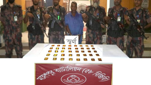 সেলিম রেজা,মহেশপুর(ঝিনাইদহ)প্রতিনিধিঃ ঝিনাইদহের মহেশপুর উপজেলার মাটিলা সীমান্ত থেকে ভারতে পাচারের সময় ৪০ পিচ সোনার বারসহ শওকত আলী (৫০) নামের এক ব্যক্তিকে আটক করেছে ৫৮ বিজিবি। বৃহস্পতিবার বিকেলে মাটিলা সীমান্তের যাদবপুর