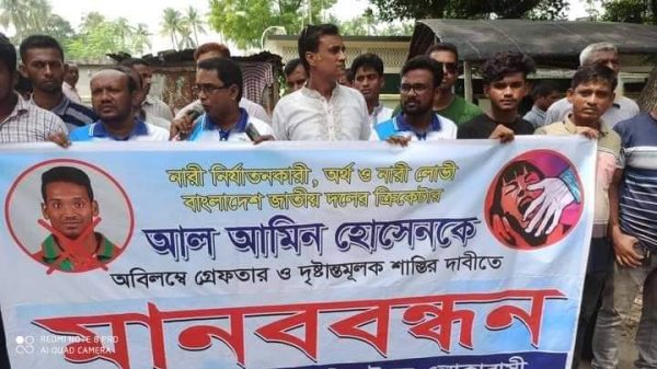 এইচ এম ইমরান, ঝিনাইদহঃ ক্রিকেটার আল আমিন হোসেনকে অবিলম্বে গ্রেফতার ও দৃষ্টান্তমূলক শাস্তি দাবিতে ঝিনাইদহের শৈলকুপায় মানববন্ধন হয়েছে। রবিবার বেলা ১১টায় শৈলকুপা উপজেলা পরিষদের সামনে এ মানববন্ধনের আয়োজন করেন আল