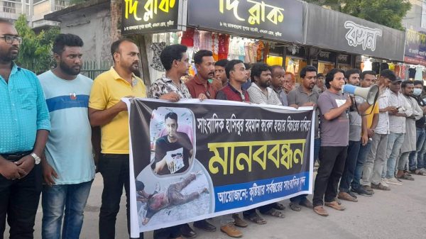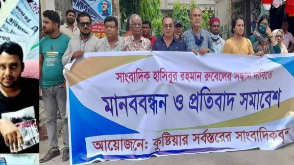 সাংবাদিক হত্যার বিচারের দাবিতে কুষ্টিয়ায় মানববন্ধন সমাচার ডেস্ক অনলাইনঃ কুষ্টিয়ায় সাংবাদিক হাসিবুর রহমান রুবেলের খুনিদের গ্রেপ্তার ও বিচারের দাবিতে মানববন্ধন হয়েছে। বৃহস্পতিবার সন্ধ্যায় কুষ্টিয়া প্রেসক্লাবের সামনে এ মানববন্ধনের আয়োজন