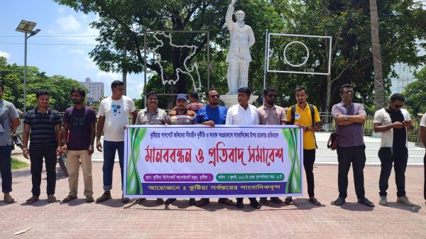 কুষ্টিয়া পাসপোর্ট অফিসে সাংবাদিকের উপর হামলার প্রতিবাদে মানব বন্ধন ও প্রতিবাদ সমাবেশ। সমাচার ডেস্ক অনলাইনঃ দৈনিক আমার সময় পত্রিকার কুষ্টিয়া জেলা প্রতিনিধি এ,জে, সুজন পেশাগত দায়িত্ব পালনকালে কুষ্টিয়া পাসপোর্ট অফিস