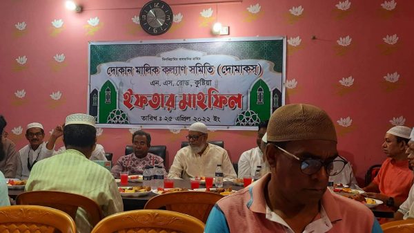 মুহাইমিনুর রহমান পলল: কুষ্টিয়া দোকান মালিক কল্যাণ সমিতির উদ্যোগে ইফতার ও দোয়া মাহফিল অনুষ্ঠিত হয়েছে। সোমবার ২৫ এপ্রিল বঙ্গবন্ধু সুপার মার্কেটের তৃতীয় তলায় সংগঠনটির নিজস্ব কার্যালয়ে অনুষ্ঠীত ইফতার মাহফিলে দোকান