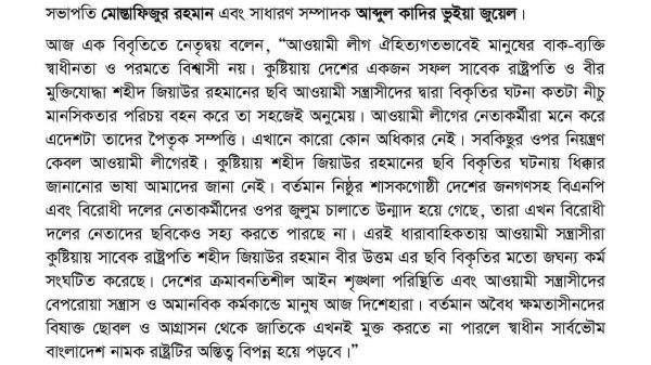 শহীদ জিয়াউর রহমান বীর উত্তম এর ছবি বিকৃতি ঘটায় স্বেচ্ছাসেবক দল কেন্দ্রীয় ভারপ্রাপ্ত সভাপতি এবং সাধারণ সম্পাদক এর নিন্দা ও ধিক্কার কুষ্টিয়ায় মহান স্বাধীনতার ঘোষক ও বহুদলীয় গণতন্ত্রের প্রবক্তা সাবেক
