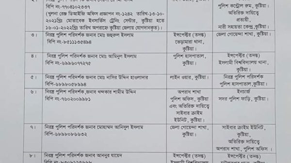 সমাচার ডেস্কঃ কুষ্টিয়া জেলা পুলিশের পুলিশ পরিদর্শক (নিরস্ত্র) পদের ৯ কর্মকর্তাকে রদবদল করা হয়েছে। রবিবার (১৬ জানুয়ারি ) কুষ্টিয়া জেলা পুলিশ সুপার মোঃ খাইরুল আলমের স্বাক্ষরিত লিখিত আদেশ থেকে এ