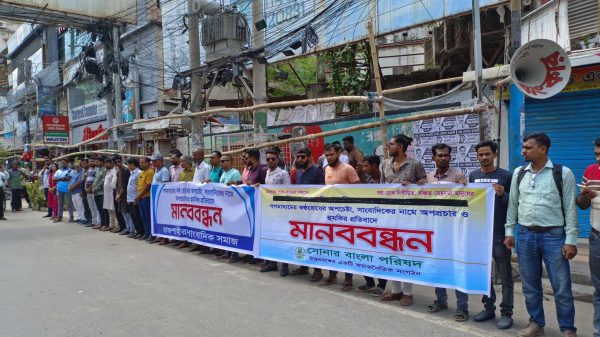 মোঃ আলাউদ্দীন মন্ডল রাজশাহী : গণমাধ্যমের কণ্ঠ রোধ, সাংবাদিকদের নামে অপপ্রচার ও হুমকির প্রতিবাদে রাজশাহীতে মানববন্ধন অনুষ্ঠিত হয়েছে। রাজশাহীর সাংবাদিক সমাজের ব্যানারে আয়োজিত মানববন্ধন থেকে যমুনা টেলিভিশনের সাংবাদিক শিবলী নোমানের