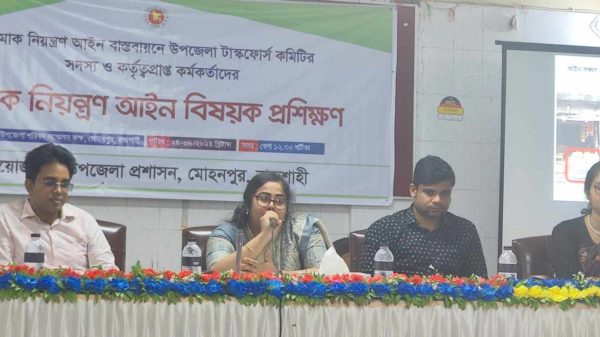 মোঃ আলাউদ্দীন মন্ডল রাজশাহী : রাজশাহীঃ তামাক নিয়ন্ত্রণ আইন বাস্তবায়নে রাজশাহীর মোহনপুরে দিনব্যাপী প্রশিক্ষণ কর্মশালা অনুষ্ঠিত হয়েছে। সোমবার (২৪ জুন) বেলা সাড়ে ১২টা হতে সারাদিনব্যাপী মোহনপুর উপজেলা পরিষদ সম্মেলন কক্ষে