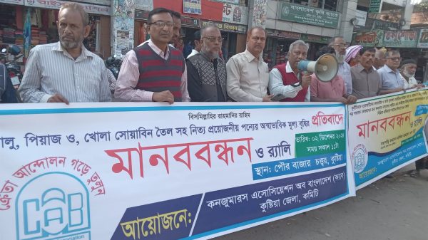 নিজস্ব প্রতিনিধি : কুষ্টিয়ায় দুর্নীতিবাজ ব্যবসায়ীদের মূল্য কারসাজি ও অতিরিক্ত মুনাফার কারণে আলু-পিয়াজ সহ নিত্যপ্রয়োজনীয় পণ্যের অস্বাভাবিক মূল্য বৃদ্ধিসহ খোলা ভোজ্য তেল বিক্রির প্রতিবাদে মানববন্ধন কর্মসূচি পালন করা হয়েছে। সোমবার