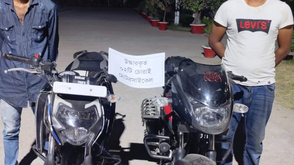 মোঃ রবিউল ইসলাম হৃদয়, কুষ্টিয়া : কুষ্টিয়ায় চোরাইকৃত মোটরসাইকেল ক্রয়-বিক্রয়ের সময় জেলা গোয়েন্দা (ডিবি) পুলিশের হাতে মোঃ সবুর হাসান(৩৩) ও মোঃ আরিফুল ইসলাম ডিজে (২৬) নামের দুইজন গ্রেফতার হয়েছে। এসময়