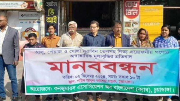 মাহমুদ হাসান রনি, চুয়াডাঙ্গা প্রতিনিধিঃ চুয়াডাঙ্গায় আলু, পেঁয়াজ ও খোলাসয়াবিন তেলসহ নিত্য প্রয়োজনীয় পণ্যের অস্বাভাবিক মুল্য বৃদ্ধির প্রতিবাদে মানববন্ধন অনুষ্ঠিত হয়েছে। গতকাল সোমবার সকাল ১০ টায় চুয়াডাঙ্গা শহীদ আবুল কাসেম