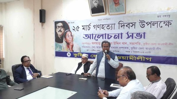 নিজস্ব প্রতিনিধিঃ গণহত্যা দিবস উপলক্ষ্যে কুষ্টিয়ায় আওয়ামী লীগের আলোচনা সভা অনুষ্ঠিত হয়েছে। সোমবার (২৫ মার্চ) বেলা ৩টার দিকে শহরের বঙ্গবন্ধু সুপার মার্কেট জেলা আওয়ামী লীগ কার্যালয়ে এ আলোচনা সভা হয়।