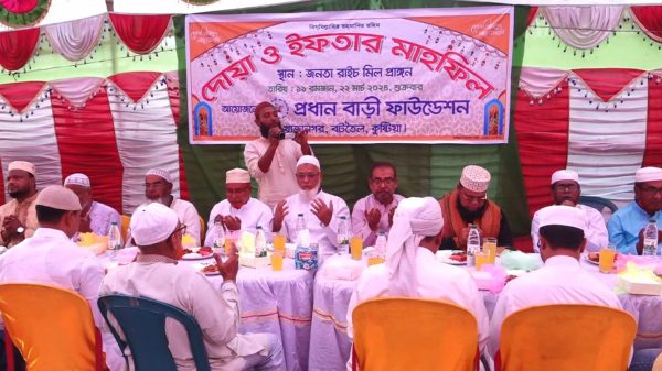 নিজস্ব প্রতিনিধি: কুষ্টিয়ায় প্রধানবাড়ি ফাউন্ডেশনের উদ্দ্যোগে ইফতার ও দোয়া মাহফিল অনুষ্ঠিত হয়েছে। শুক্রবার বিকেলে খাজানগরে অনুষ্ঠিত এ ইফতার মাহফিলে প্রধান অতিথি হিসেবে উপস্থিত ছিলেন বাংলাদেশ চালকল মালিক সমিতির সভাপতি আব্দুর