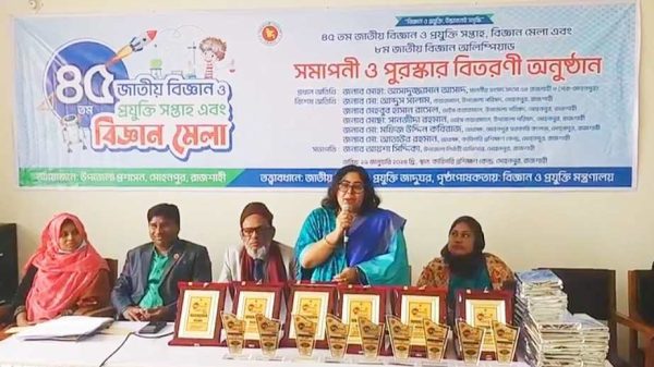 মোঃ আলাউদ্দীন মন্ডল রাজশাহী : রাজশাহীর মোহনপুর উপজেলায় জাতীয় বিজ্ঞান ও প্রযুক্তি সপ্তাহ উপলক্ষে ৩ দিন ব্যাপি ৪৫তম বিজ্ঞান মেলা ও ৮ম বিজ্ঞান অলিম্পিয়াড মেলার শেষ দিনে পুরস্কার বিতরণ ও